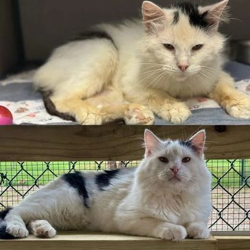 We would like to reintroduce you to Frenzy and show you his glow up!Top picture was when he first came in and bottom picture was just this week! He is looking and feeling like a whole new man. He is no longer stained and his coat is coming in beautifully! Frenzy came to us in June from the pound as an unclaimed stray when he was found roaming around at Fort Frenzy. He was thin, stained, and his tail was covered in cockleburs. We believe this boy is around 5ish years old, but it is hard to say. He is very friendly and loves to be pet and rub against your legs. He is decent with other kitties, but does like to have his space. He likes dogs and we even have used him to cat test dogs. He doesn’t always enjoy being picked up, so might do better in a home with older kids. He is neutered, current on vaccines, negative for FIV/FELV, and microchipped.